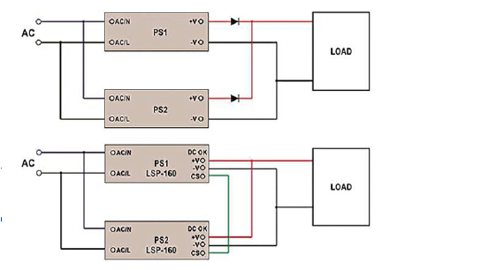 A conceção clássica de uma alimentação elétrica redundante consiste em duas fontes de alimentação ligadas em paralelo, cujas saídas são desacopladas através de díodos de bloqueio. Estes díodos impedem que a corrente retorne para a outra fonte de alimentação no caso de uma avaria ou curto-circuito numa das fontes. Isto garante que o consumidor continua a ser alimentado com energia elétrica.